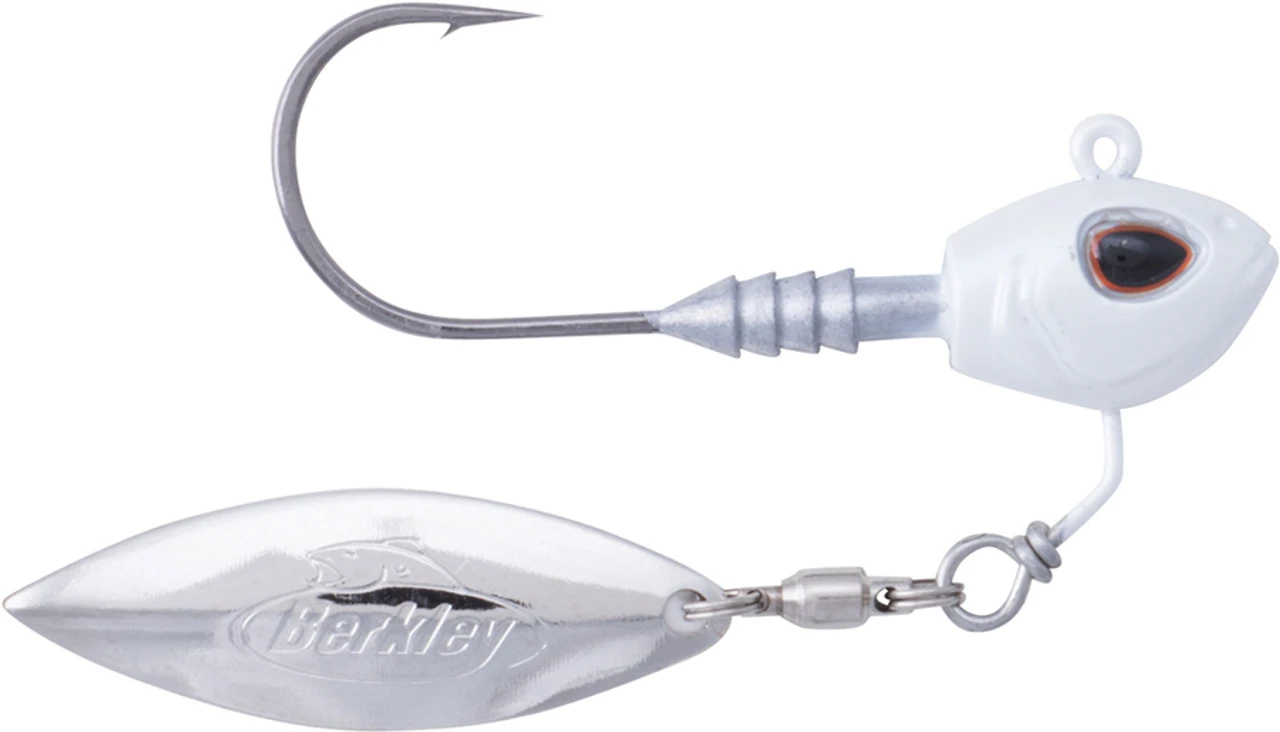 Adding some extra flare to a tried and true formula, the Berkley Fusion19 Underspin refines the traditional jig head with the addition of a miniature willow blade for enhanced attraction. Attached to a ball bearing swivel positioned under the head, the spinning willow blade on the Fusion19 Underspin is designed to provide a subtle flash and vibration that could make all the difference in the effectiveness of your presentation. With a 90 degree line tie, these underspin jig heads are ideal for use in both vertical jigging or cast-and-retrieve applications. The conical bait keeper securely locks the fluke, swimbait, or other soft plastic of your choice firmly in place, while the rugged fusion19 hook features a razor sharp needle point for quick penetration and perfect hook sets.